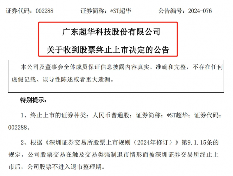 值得一提的是,8月5日,*ST超華公告稱,公司于2024年8月5日收到深圳證券交易所出具的《關(guān)于廣東超華科技股份有限公司股票終止上市的決定》,深交所決定終止公司股票上市。根據(jù)相關(guān)規(guī)定,公司股票觸及交易類強(qiáng)制退市情形,不進(jìn)入退市整理期,將于深交所作出終止上市決定后十五個(gè)交易日內(nèi)摘牌。