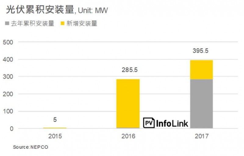 約旦截至2017年累積安裝量為395.5MW,其中在2016年共計(jì)新增280MW的裝機(jī)量,和2015年相比促使安裝量大幅成長的原因主要來自于第一輪競(jìng)標(biāo)項(xiàng)目的并網(wǎng)裝機(jī)以及Net-Metering政策刺激所致。