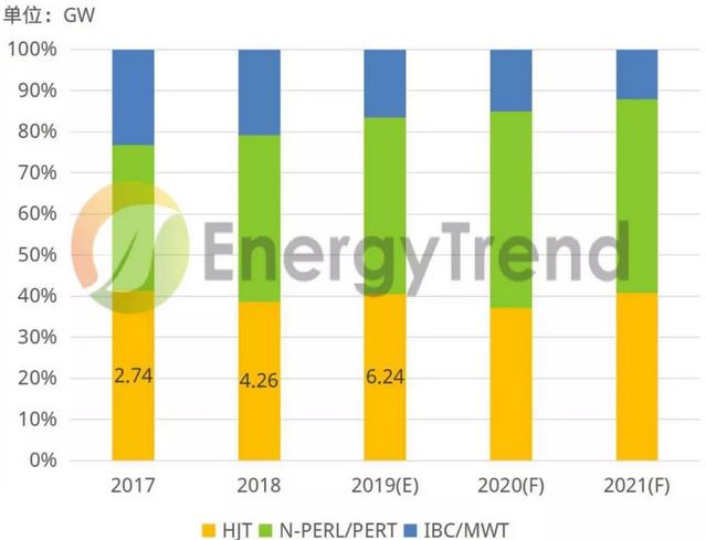 目前來看,疊瓦光伏組件擁有極大的市場潛力,而其產(chǎn)品受限于設備成本甚至專利問題,短期內,疊瓦技術在大規(guī)模商用推廣上仍存在爭議,在產(chǎn)能及產(chǎn)量方面的發(fā)展還未趕上2019大熱的半片技術,集邦新能源網(wǎng)EnergyTrend預計2019年疊瓦光伏組件的產(chǎn)能達到17GW,市占比越過10%。