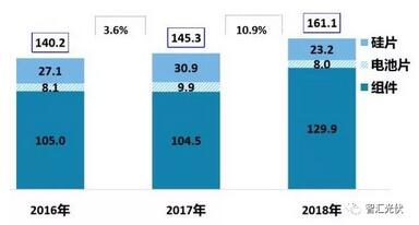 然而,這些貿(mào)易摩擦讓中國(guó)光伏企業(yè)越戰(zhàn)越強(qiáng),出口額逐年上升。根據(jù)中國(guó)光伏行業(yè)協(xié)會(huì)的統(tǒng)計(jì),盡管2018年光伏產(chǎn)品的單價(jià)下降30%,但出口額增加10%以上。近3年的光伏產(chǎn)品出口額如下圖所示。