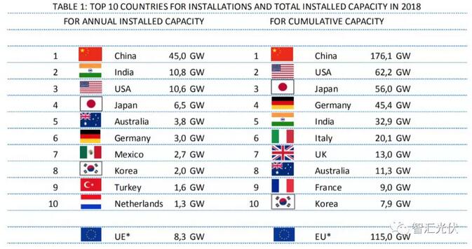 美國(guó)的光伏累計(jì)裝機(jī)占到全球第二,2018年新增裝機(jī)占到全球第三,如下圖所示。