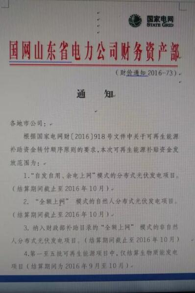 比如,之前小編報道的河北省石家莊400余戶光伏業(yè)主剛剛一次性拿到拖欠的補貼,這廂國網(wǎng)山東就下達(dá)通知:下發(fā)可再生能源補貼資金。文件圖片如下: