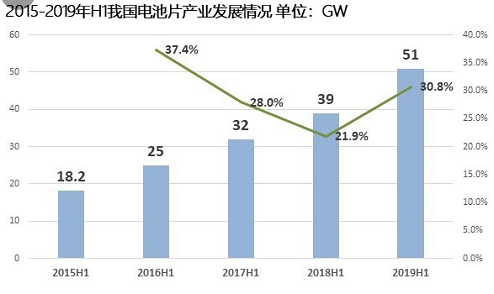 2019年上半年我國(guó)電池片產(chǎn)量約51GW,同比增長(zhǎng)30.8%;