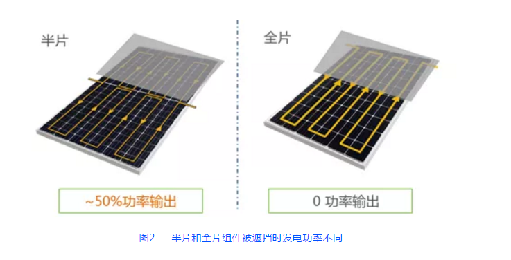 在采用豎向安裝時(shí),半片組件能夠有效抵御陰影遮擋。半片組件采用上半部分和下半部分并聯(lián)的設(shè)計(jì),在早晚陰影遮擋組件的下半部分時(shí),半片組件的上半部分仍能夠工作,實(shí)現(xiàn)50%的功率輸出,而全片組件輸出功率為0。此外,半片設(shè)計(jì)有效降低組件內(nèi)部的熱損耗,從而降低溫度系數(shù),晶科半片組件溫度系數(shù)為-0.36% W/℃,全片組件為-0.37%W/℃,在溫度較高地區(qū),組件工作溫度可能高達(dá)75℃,此時(shí)半片組件將比全片組件功率高2.5%。