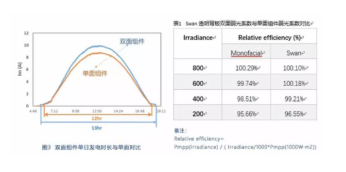 在低輻照情況下,如早晨、傍晚或多云天氣,雙面組件正背面同時(shí)受光,能夠接收更多光能,從而較單面組件具有更高的實(shí)際功率,更易達(dá)到逆變器的啟動(dòng)條件,能夠?qū)崿F(xiàn)更長時(shí)間發(fā)電,如圖3。第三方測試報(bào)告同時(shí)顯示,雙面組件較單面組件,具有更好的弱光響應(yīng)。