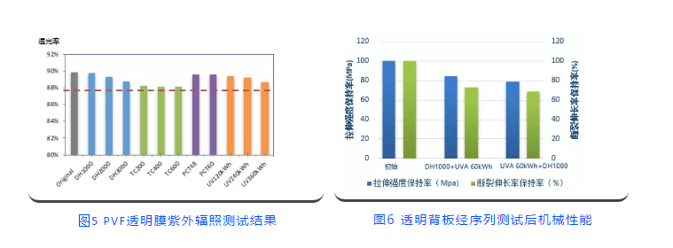 圖5 PVF透明膜紫外輻照測試結(jié)果圖6 透明背板經(jīng)序列測試后機(jī)械性能相對雙玻產(chǎn)品,透明背板產(chǎn)品具有更低的重量(質(zhì)量上減輕超過30%),能夠?yàn)榭蛻艄?jié)約15%支架成本和20%安裝人工成本,從而節(jié)約超過3%的BOS成本。另外,透明背板產(chǎn)品背板外層采用PVF膜,材料分子結(jié)構(gòu)中存在高密度的C-F鍵,具有很強(qiáng)的疏水性,且不易吸附灰塵,戶外運(yùn)行時(shí),通過雨水沖刷或簡單的清洗方式,即可除去表面的臟污,組件長期運(yùn)維過程中,組件背面的清洗維護(hù)成本較低。