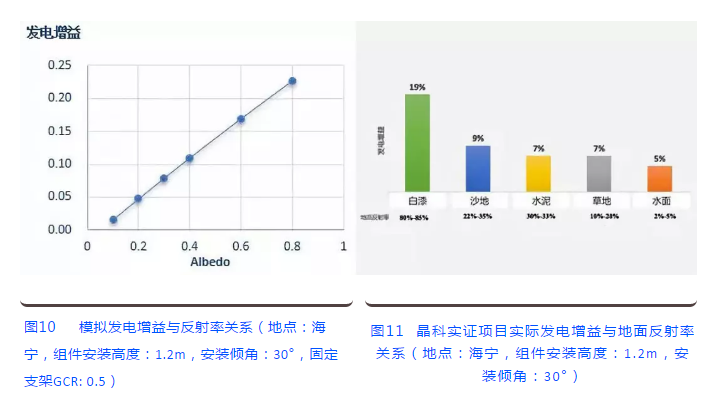 地面反射率,是環(huán)境中對雙面增益影響最大的因素。通過PVsyst模擬可得到雙面組件的發(fā)電增益幾乎與地面反射率成正比,如圖10。通過實(shí)際測試不同地面類型的晶科雙面組件發(fā)電增益,與模擬結(jié)果相一致,如圖11。