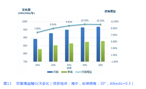 GCR是組件面積與土地面積的比值。GCR降低,組件行間距增加,將使雙面組件背面接收到更多的反射光,從而產(chǎn)生更多電量。對于單面組件來說,GCR降低(行間距增加)會(huì)降低組件陰影遮擋,同樣增加發(fā)電量,但增加的幅度和極限均不及雙面組件[1]。隨著GCR的降低,雙面發(fā)電增益先增加后達(dá)到穩(wěn)定,如圖13。