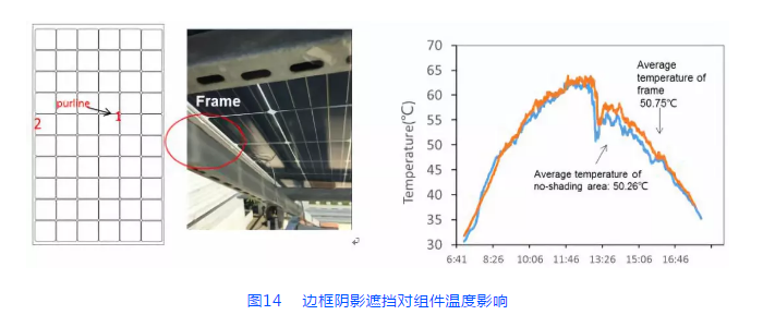 組件邊框和背面支架遮擋影響晶科SWAN系列雙面組件采用半片搭配分體式接線盒設(shè)計(jì),接線盒不遮擋背面電池。邊框?qū)Ρ趁嬲趽趺娣e僅2.6~3.4%,如圖14所示,雙面組件邊框陰影區(qū)域組件溫度與非陰影區(qū)域溫度十分接近,邊框陰影幾乎不會(huì)導(dǎo)致熱斑等問題。