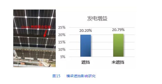 一般來說雙面組件需盡量搭配背面無遮擋的支架系統(tǒng),但系統(tǒng)設(shè)計(jì)中橫梁對雙面組件的背面遮擋影響可以通過調(diào)節(jié)橫梁寬度、反射率和距離背面的距離來降低。晶科在反射率為80%的地面上進(jìn)行雙面組件橫梁遮擋研究發(fā)現(xiàn),采用寬度為50mm的黑色背板(代替橫梁,透過率幾乎為0且反射率很低)遮擋背面,背板距組件背面距離為50mm,雙面發(fā)電增益遮擋情況下為20.20%,無黑色背板遮擋時(shí)為20.79%,幾乎相等。在實(shí)際低反射率條件下,橫梁對背面的遮擋影響將更低。一般來說,建議背面橫梁距離組件在50mm以上,從而減小橫梁遮擋對雙面組件發(fā)電的影響。