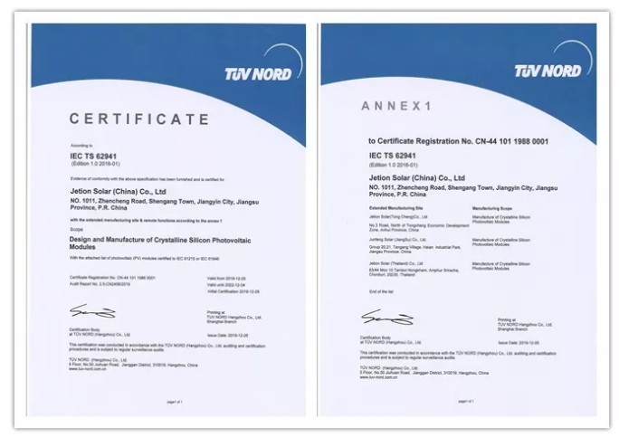 近期,全球知名光伏制造商中建材浚鑫科技有限公司(以下簡稱“中建材浚鑫”)宣布公司成功取得IEC/TS 62941: 2016質(zhì)量體系認證。據(jù)介紹,IEC/TS 62941: 2016標(biāo)準(zhǔn)對企業(yè)在質(zhì)量管理提出了更高更嚴(yán)苛的要求,目前光伏行業(yè)內(nèi)獲得此認證的企業(yè)屈指可數(shù),這也表明了中建材浚鑫近年來在質(zhì)量管理上取得了巨大的提升,已經(jīng)達到了業(yè)內(nèi)領(lǐng)先水平。