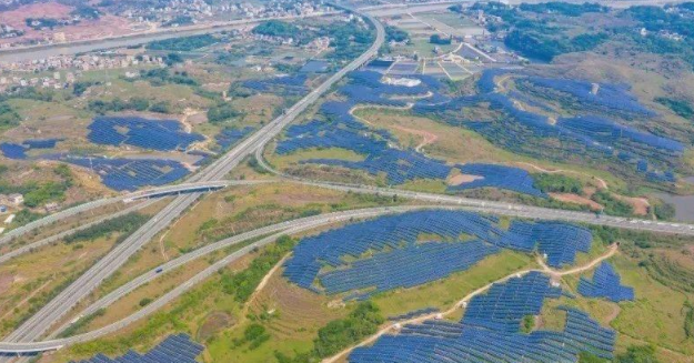 在橫陂鎮(zhèn)與河?xùn)|鎮(zhèn)交界處,一排排太陽能光伏板覆蓋了1300多畝撂荒山地,將太陽能轉(zhuǎn)化為電能。