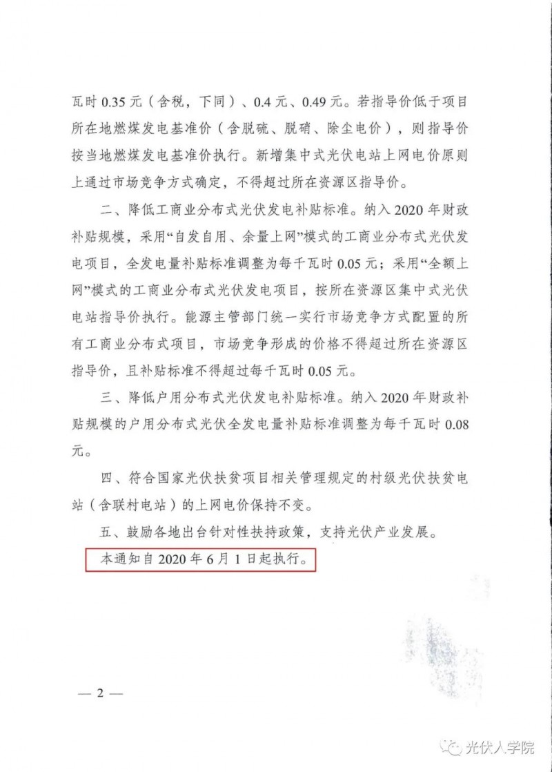 3月31日,國(guó)家發(fā)改委發(fā)布了關(guān)于2020年光伏發(fā)電上網(wǎng)電價(jià)政策有關(guān)事項(xiàng)的通知,通知內(nèi)提到:納入2020年財(cái)政補(bǔ)貼規(guī)模的戶用分布式光伏全發(fā)電量補(bǔ)貼標(biāo)準(zhǔn)調(diào)整為每千瓦時(shí)0.08元,執(zhí)行時(shí)間為2020年6月1日。這也就意味著從明天開(kāi)始,戶用光伏就開(kāi)始有補(bǔ)貼啦!