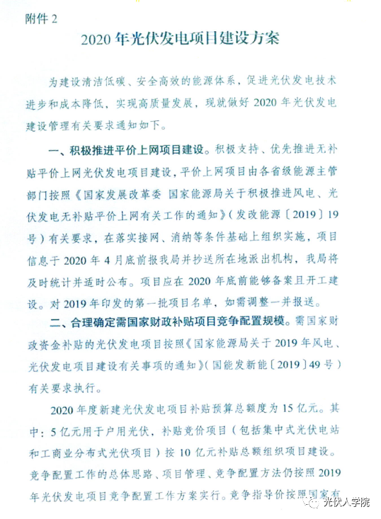 3月6日,國(guó)家能源局發(fā)布了關(guān)于2020年風(fēng)電、光伏發(fā)電項(xiàng)目建設(shè)有關(guān)事項(xiàng)的通知中提到,2020年度新建光伏發(fā)電項(xiàng)目補(bǔ)貼預(yù)算總額度為15億元。其中:5億元用于戶用光伏,補(bǔ)貼競(jìng)價(jià)項(xiàng)目(包括集中式光伏電站和工商業(yè)分布式光伏項(xiàng)目)按10億元補(bǔ)貼總額組織項(xiàng)目建設(shè)。