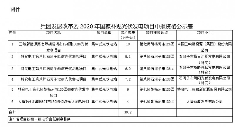 根據(jù)公示,2020年6月5日兵團發(fā)展改革委組織專家對第七師、第八師申報2020年國家補貼光伏發(fā)電項目進行了復核。此次,獲得指標的項目共計392MW,其中三峽100MW、特變電工252MW、大唐40MW。