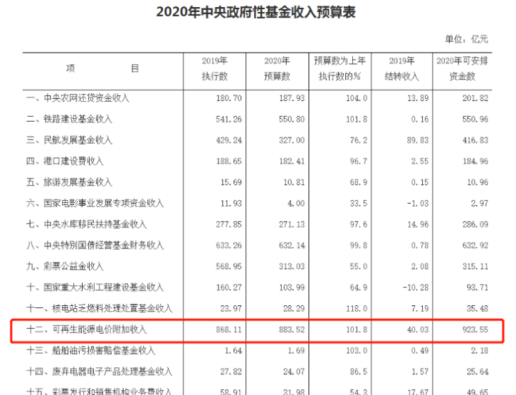 財(cái)政部公布《2020年中央財(cái)政預(yù)算》,2020年可再生能源電價(jià)附加收入預(yù)算883.52億元,2020年可再生能源電價(jià)附加支出預(yù)算數(shù)923.55億元。