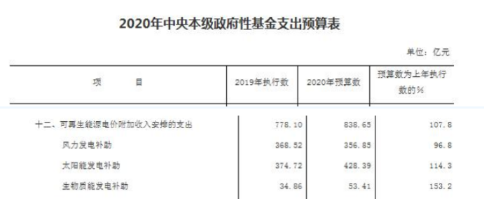 另在《中央本級政府性基金支出預(yù)算表》中,2020年光伏補(bǔ)助預(yù)算為428.39億元,預(yù)算數(shù)為上年執(zhí)行數(shù)的114.3%。