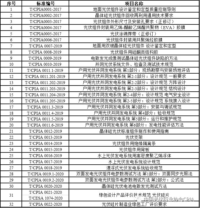 中國(guó)光伏行業(yè)協(xié)會(huì)自2016年3月25日成立中國(guó)光伏行業(yè)協(xié)會(huì)標(biāo)準(zhǔn)化技術(shù)委員會(huì),正式開始光伏領(lǐng)域內(nèi)團(tuán)體標(biāo)準(zhǔn)的制修訂工作。截止2020年3月,已發(fā)布32項(xiàng)協(xié)會(huì)標(biāo)準(zhǔn),涉及光伏用輔材輔料、戶用光伏系統(tǒng)、水上光伏系統(tǒng)、測(cè)試方法、綠色制造等方面,在研標(biāo)準(zhǔn)27項(xiàng)。