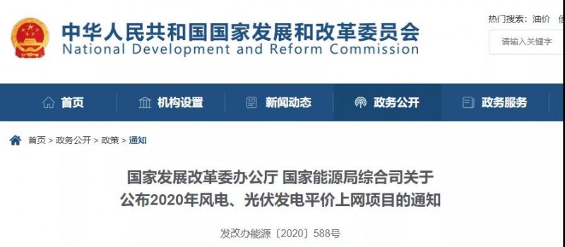 國(guó)家發(fā)改委官方網(wǎng)站發(fā)布了“國(guó)家發(fā)展改革委辦公廳 國(guó)家能源局綜合司關(guān)于公布2020年風(fēng)電、光伏發(fā)電平價(jià)上網(wǎng)項(xiàng)目的通知”。通知明確:結(jié)合各省級(jí)能源主管部門報(bào)送信息,2020年風(fēng)電平價(jià)上網(wǎng)項(xiàng)目裝機(jī)規(guī)模1139.67萬(wàn)千瓦、光伏發(fā)電平價(jià)上網(wǎng)項(xiàng)目裝機(jī)規(guī)模3305.06萬(wàn)千瓦。