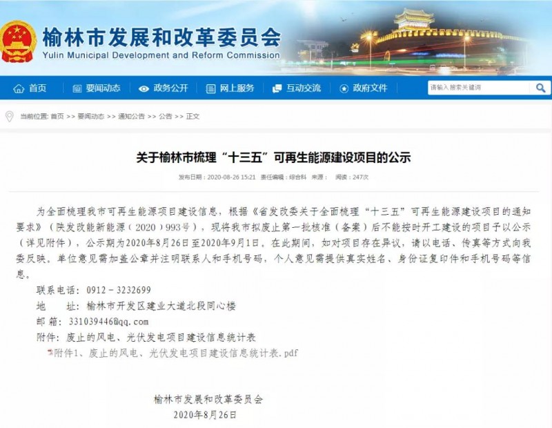 為全面梳理我市可再生能源項目建設(shè)信息,根據(jù)《省發(fā)改委關(guān)于全面梳理“十三五”可再生能源建設(shè)項目的通知要求》(陜發(fā)改能新能源﹝2020﹞993號),現(xiàn)將我市擬廢止第一批核準(備案)后不能按時開工建設(shè)的項目予以公示(詳見附件),公示期為2020年8月26日至2020年9月1日。在此期間,如對項目存在異議,請以電話、傳真等方式向我委反映。單位意見需加蓋公章并注明聯(lián)系人和手機號碼,個人意見需提供真實姓名、身份證復(fù)印件和手機號碼等信息。