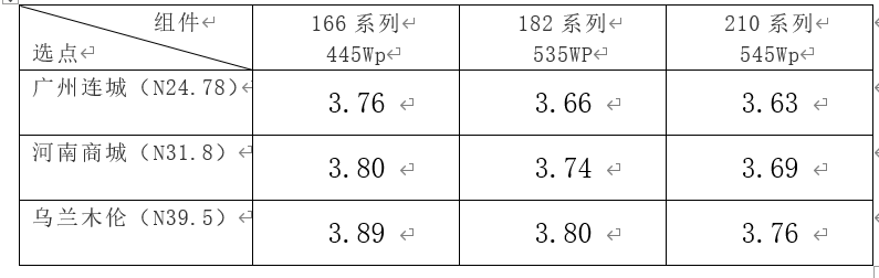 為此,山東電力工程咨詢?cè)河邢薰踞槍?duì)目前市面上主流的組件類(lèi)型(166型445Wp組件、182型535Wp組件、210型545Wp組件),以及不同緯度(北緯24.8°廣州連城、北緯31.8°河南商城、北緯39.5°內(nèi)蒙烏蘭木倫)的資源環(huán)境條件,做了詳細(xì)的工程量計(jì)算、成本分析和投資收益對(duì)比,具體對(duì)比如下:
