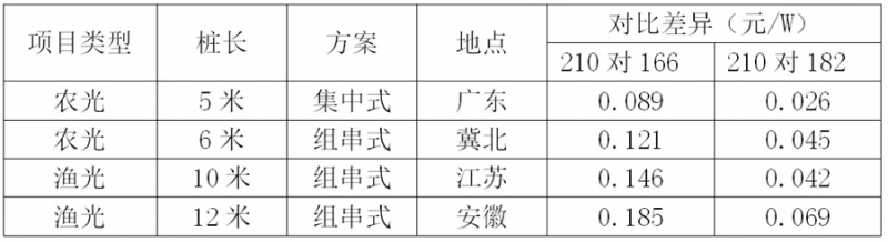 210產(chǎn)品的550W、600W以及660W,都是為大型地面電站設(shè)計的產(chǎn)品,目前進(jìn)入量產(chǎn)的型號是550W。我們搜集了河北能源工程設(shè)計院和山東電力工程咨詢院兩家單位對于此款型號在不同緯度項目的系統(tǒng)造價差異對比結(jié)果,如下表: