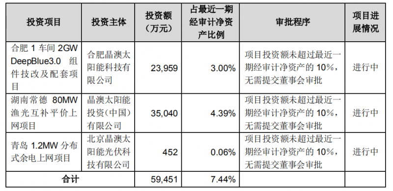 此外,根據(jù)公告,晶澳太陽能近期還有3個(gè)正在審批中且尚未達(dá)到董事會(huì)審議標(biāo)準(zhǔn)的對(duì)外投資事項(xiàng),3個(gè)項(xiàng)目投資總額達(dá)5.9451億元,分別為:合肥1車間2GWDeepBlue3.0組件技改及配套項(xiàng)目、湖南常德80MW漁光互補(bǔ)平價(jià)上網(wǎng)項(xiàng)目、青島1.2MW分布式余電上網(wǎng)項(xiàng)目。公告顯示以上三個(gè)項(xiàng)目項(xiàng)目投資額未超過最近一期經(jīng)審計(jì)凈資產(chǎn)的10%,無需提交董事會(huì)審批。詳情如下: