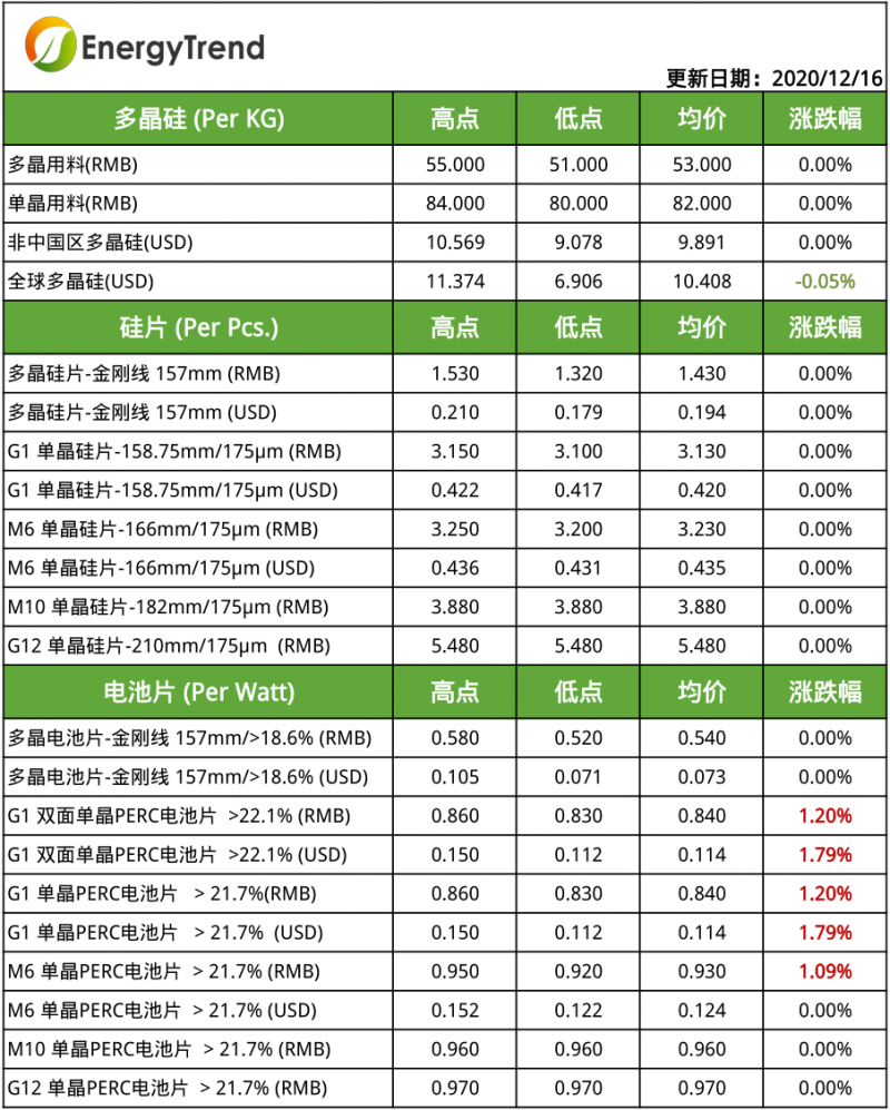 光伏產(chǎn)業(yè)供應(yīng)鏈價格(12月16日) 光伏產(chǎn)業(yè)網(wǎng)訊 發(fā)布日期:2020-12-17 核心提示: 光伏產(chǎn)業(yè)供應(yīng)鏈價格(12月16日) 原標(biāo)題:EnergyTrend12月16日光伏產(chǎn)業(yè)供應(yīng)鏈價格