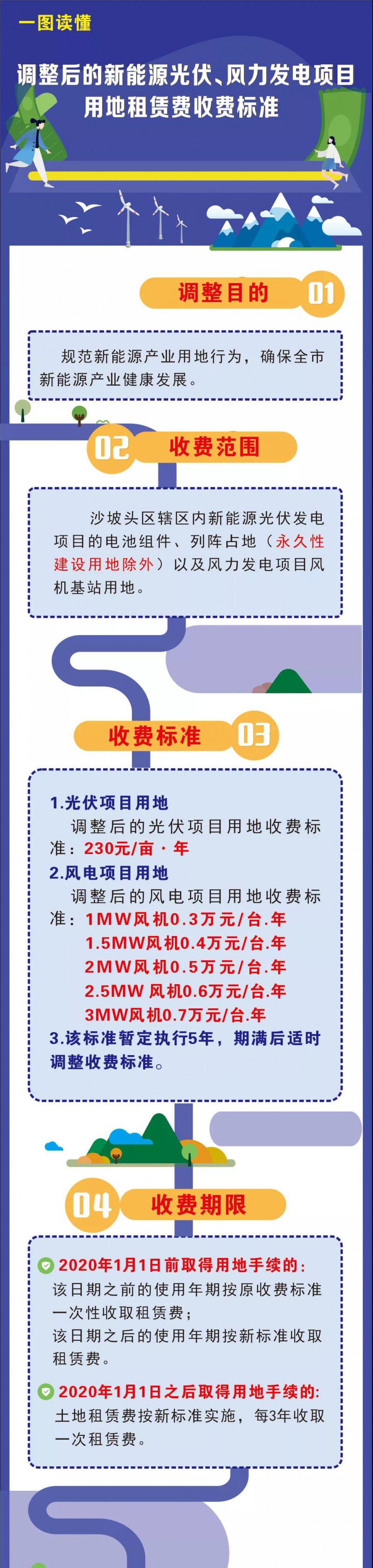 為規(guī)范新能源產(chǎn)業(yè)用地行為,確保全市新能源產(chǎn)業(yè)健康發(fā)展,決定對(duì)我市沙坡頭區(qū)新能源光伏、風(fēng)力發(fā)電項(xiàng)目土地租賃費(fèi)收費(fèi)標(biāo)準(zhǔn)進(jìn)行調(diào)整?,F(xiàn)將有關(guān)事宜通知如下:
