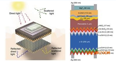盡管常規(guī)串聯(lián)的太陽(yáng)能電池也可以通過吸收額外波長(zhǎng)的光轉(zhuǎn)化為電能,但此次科學(xué)家們證明:使用雙面串聯(lián)配置,可以超過目前公認(rèn)的串聯(lián)配置的性能極限。這種利用傳統(tǒng)硅基層和鈣鈦礦制成的另一層串聯(lián)組合的新系統(tǒng),不但可以搜集到更多的能量,還可以捕獲許多原本被浪費(fèi)掉的、從地面反射和散射的光,前所未有地增加串聯(lián)太陽(yáng)能電池的效能。