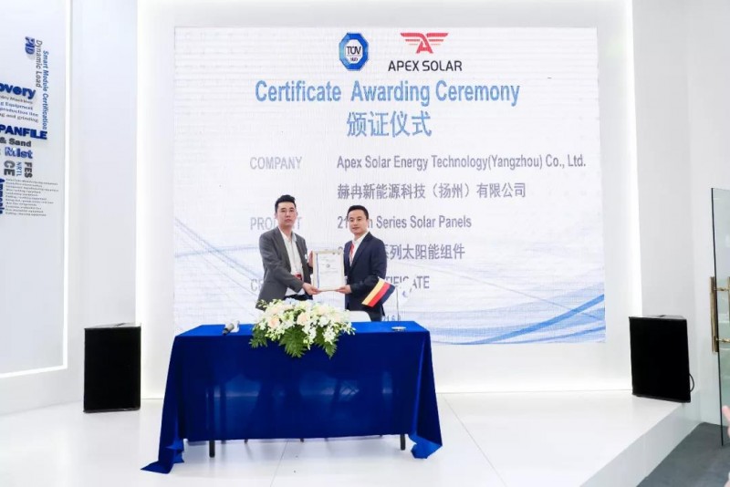 中國(guó)/上海 ,6月3日,在第十五屆(2021)國(guó)際太陽(yáng)能光伏與智慧能源(上海)展覽會(huì)暨論壇期間, TÜV南德意志大中華集團(tuán)(以下簡(jiǎn)稱“TÜV 南德”)為赫冉新能源科技(揚(yáng)州)有限公司(以下簡(jiǎn)稱“赫冉新能源”)所展出的210單玻產(chǎn)品頒發(fā)TÜV 南德認(rèn)證證書。TÜV南德智慧能源高級(jí)運(yùn)營(yíng)總監(jiān)以及首席簽證官?gòu)堊A?、赫冉新能源董事長(zhǎng)陳建輝等一席嘉賓出席了該頒證儀式。