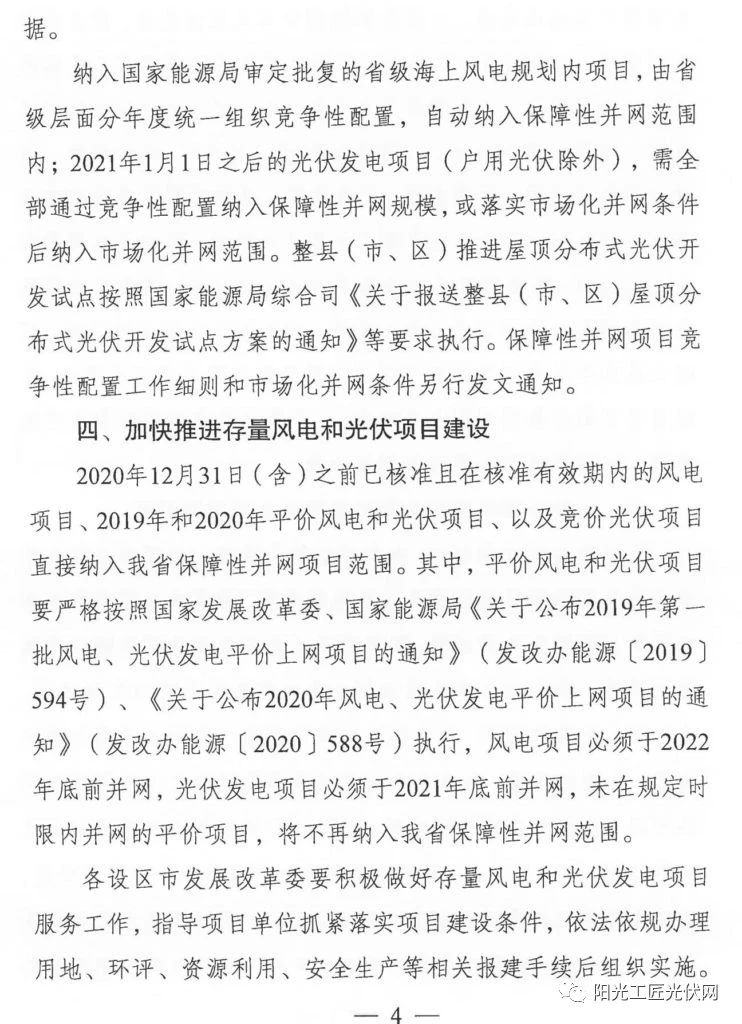 2020年12月31日(含)之前已核準(zhǔn)且在核準(zhǔn)有效期內(nèi)的風(fēng)電項目、2019年和2020年平價風(fēng)電和光伏項目、以及競價光伏項目直接納入我省保障性并網(wǎng)項目范圍。其中,平價風(fēng)電和光伏項目要嚴(yán)格按照國家發(fā)展改革委、國家能源局《關(guān)于公布2019年第一批風(fēng)電、光伏發(fā)電平價上網(wǎng)項目的通知》(發(fā)改辦能源〔2019〕594號)、《關(guān)于公布2020年風(fēng)電、光伏發(fā)電平價上網(wǎng)項目的通知》(發(fā)改辦能源〔2020〕588號)執(zhí)行,風(fēng)電項目必須于2022年底前并網(wǎng),光伏發(fā)電項目必須于2021年底前并網(wǎng),未在規(guī)定時限內(nèi)并網(wǎng)的平價項目,將不再納入我省保障性并網(wǎng)范圍。