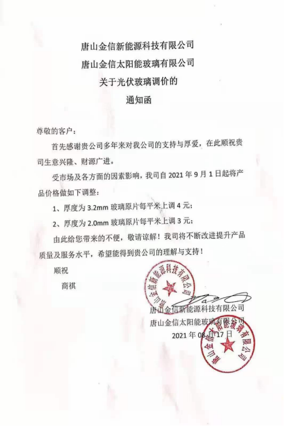 8月17日,唐山金信太陽能玻璃有限公司發(fā)布調(diào)價(jià)通知函,自9月1日起,3.2mm光伏玻璃原片每平米上調(diào)4元,2.0mm光伏玻璃原片每平米上調(diào)3元。