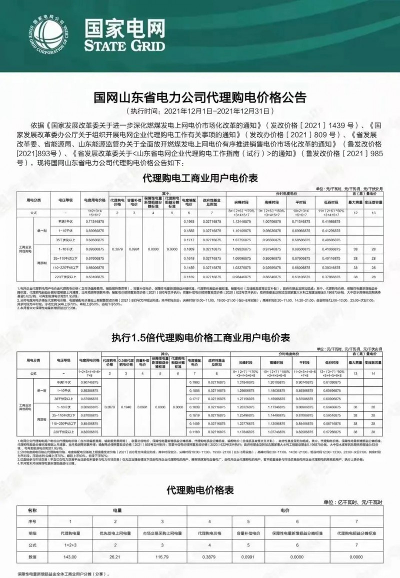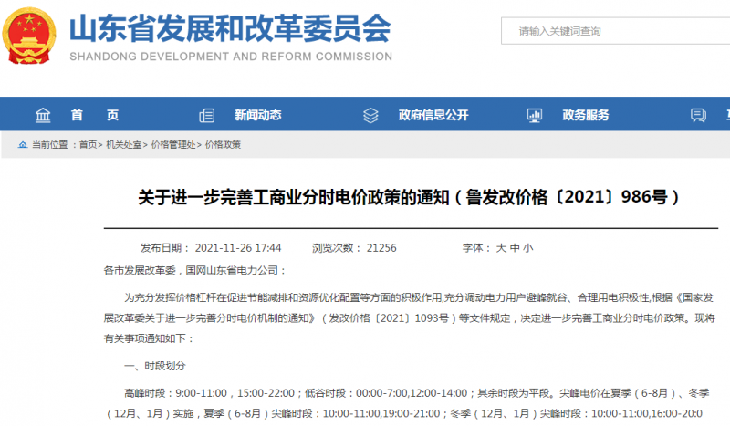 山東省發(fā)改委發(fā)布了《關(guān)于進(jìn)一步完善工商業(yè)分時電價政策的通知》(魯發(fā)改價格〔2021〕986號),確定自2022年1月1日開始,山東省工商業(yè)電價在基準(zhǔn)價50%~170%之間浮動。