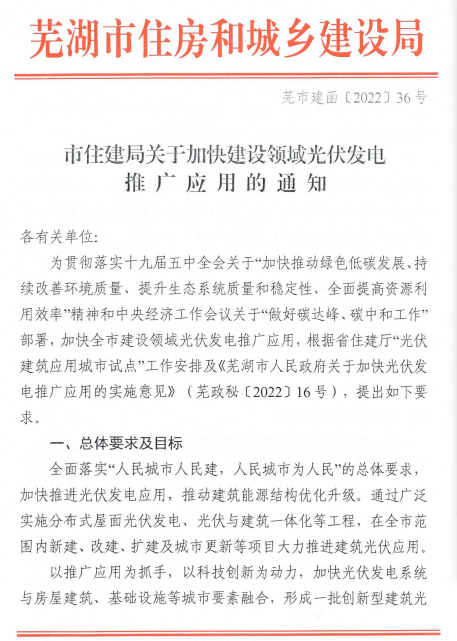 3月10日,安徽蕪湖市住建局發(fā)布關(guān)于加快建設(shè)領(lǐng)域光伏發(fā)電推廣應(yīng)用的通知,通知指出,全市范圍內(nèi)新建、改建、擴(kuò)建的工業(yè)和民用建筑項目屋面應(yīng)按光伏發(fā)電、光伏與建筑一體化設(shè)計、建造。其中,工業(yè)建筑單體屋頂面積1000平方米以上應(yīng)同步安裝光伏發(fā)電系統(tǒng),太陽發(fā)電組件面積不少于屋頂面積的70%。