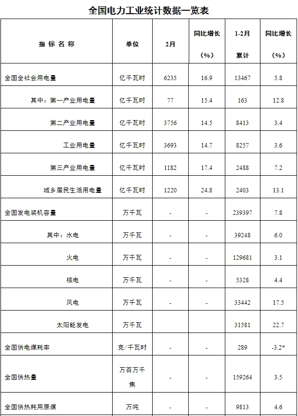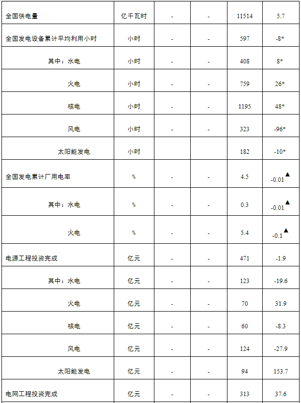 注:1.全社會用電量為全口徑數(shù)據(jù),全國供電量為調(diào)度口徑數(shù)據(jù)。2.“同比增長”列中,標(biāo)*的指標(biāo)為絕對量;標(biāo)▲的指標(biāo)為百分點(diǎn)。
