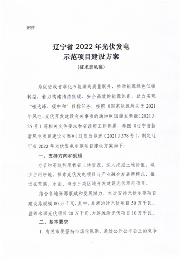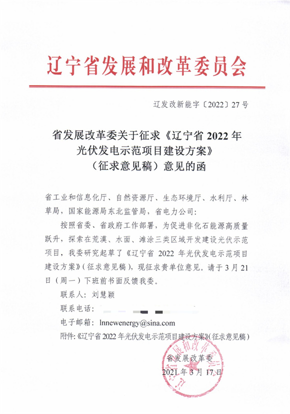 3月17日,遼寧省發(fā)展改革委關(guān)于征求《遼寧省2022年光伏發(fā)電示范項(xiàng)目建設(shè)方案》(征求意見(jiàn)稿)意見(jiàn)的函。