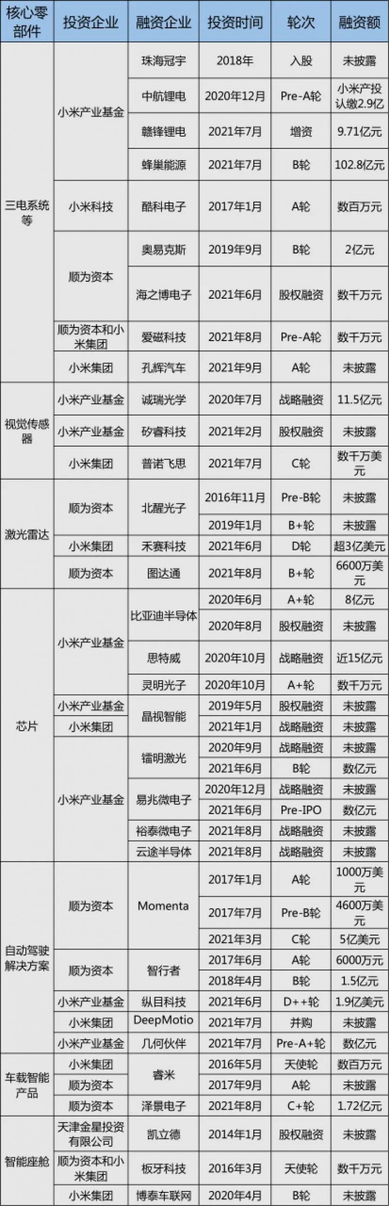 截至目前,包括雷軍個人的天使投資機構(gòu)順為創(chuàng)業(yè)、小米集團、小米產(chǎn)投、順為資本這幾家投資機構(gòu),已先后投資了近40家汽車產(chǎn)業(yè)鏈企業(yè),涵蓋智能駕駛、車載芯片、動力電池等眾多產(chǎn)業(yè)鏈核心技術(shù)領(lǐng)域。