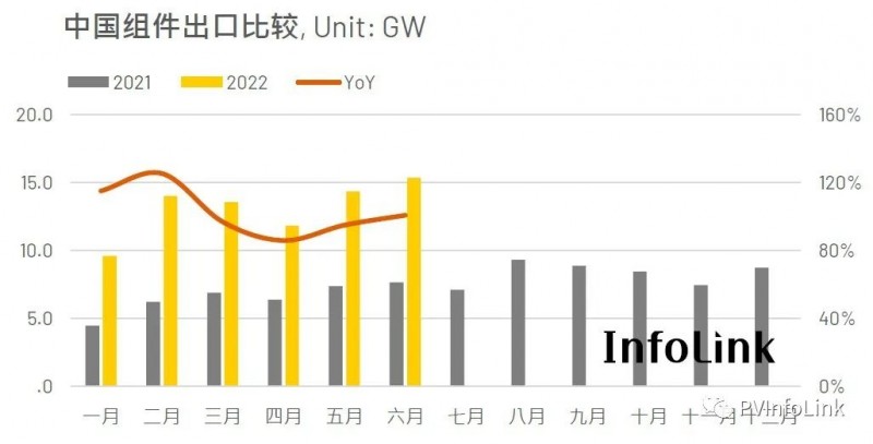 盡管因光伏供應鏈上下游產能不匹配造成光伏組件價格相比去年仍處于相對高位的狀況下,受惠于海外各國政府、企業(yè)加速能源轉型,以及區(qū)域沖突造成的能源供應危機等環(huán)境下,海外市場對于光伏產品的需求持續(xù)成長,根據(jù)Infolink統(tǒng)計分析中國海關出口數(shù)據(jù)顯示,中國上半年出口組件達到了78.7GW,相較去年同期成長了102%,且單月同比都有接近一倍的漲幅,顯示海外市場對中國光伏產品的火熱需求。