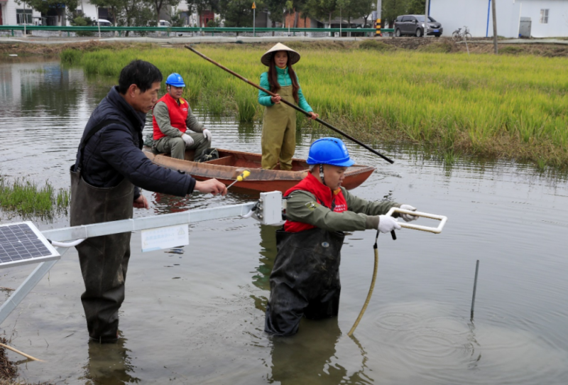 湖北潛江供電公司工作人員在蝦田安裝水質(zhì)監(jiān)測設(shè)備