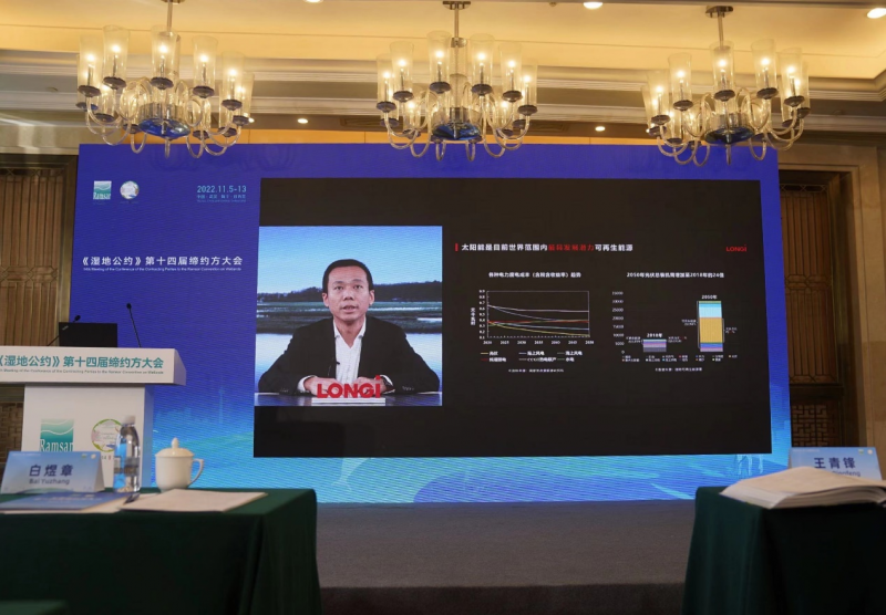 在邊會上,隆基綠能系統(tǒng)解決方案部副總裁倪久建以視頻形式作“光伏推動生態(tài)保護 共建零碳未來”的主題演講,與濕地、林草領域的多位專家學者共同探討光伏與生態(tài)的結合,以及對生態(tài)、濕地的保護價值,為濕地保護與修復貢獻智慧、建言獻策。