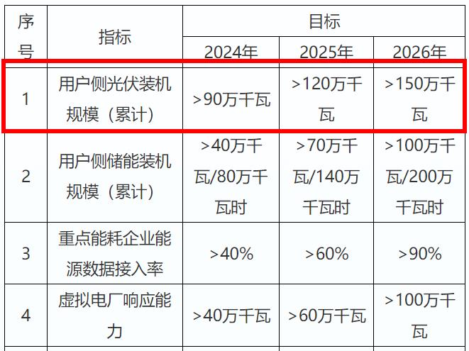 關于用戶側光伏裝機規(guī)模目標,文件明確,到2024年累計裝機規(guī)模大于90萬千瓦,到2025年累計裝機規(guī)模大于120萬千瓦,到2026年累計裝機規(guī)模大于150萬千瓦。