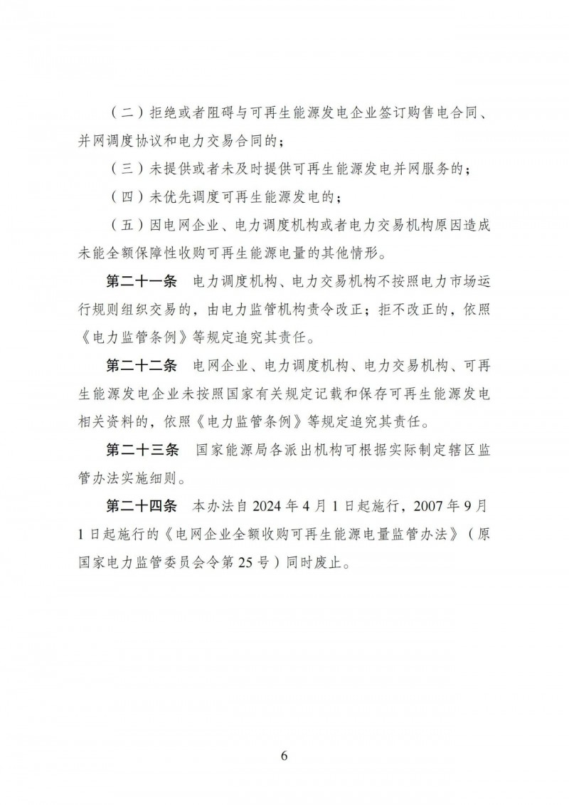 本辦法自2024年4月1日起施行,2007年9月1日起施行的《電網(wǎng)企業(yè)全額收購可再生能源電量監(jiān)管辦法》(原國家電力監(jiān)管委員會令第25號)同時廢止。