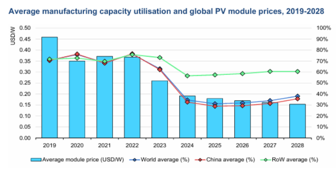 圖3 全球2019~2028年平均產(chǎn)能利用率和光伏組件價(jià)格
