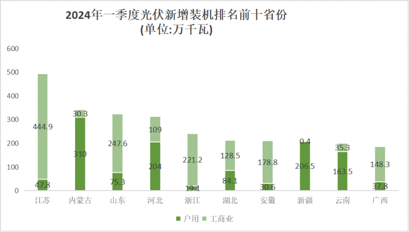 2024年一季度,分布式新增并網(wǎng)容量排名前十的省份包括江蘇(4.45GW)、山東(2.48GW)、浙江(2.21GW)、安徽(1.79GW)、廣西(1.48GW)、河南(1.478GW)、湖北(1.29GW)、廣東(1.24GW)、河北(1.09GW)、福建(0.99GW)