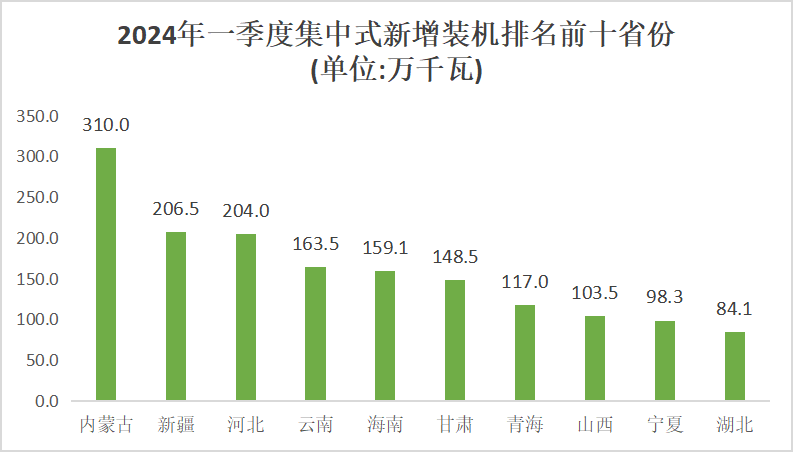 2024年一季度,集中式光伏新增并網(wǎng)容量排名十的省份包括內(nèi)蒙古(3.1GW)、新疆(2.07GW)、河北(2.04GW)、云南(1.64GW)、海南(1.59GW)、甘肅(1.49GW)、青海(1.17GW)、山西(1.04GW)、寧夏(0.98GW)、湖北(0.84GW)