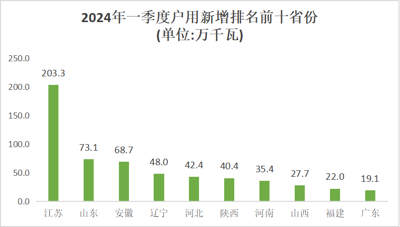 2024年一季度,戶用光伏新增并網(wǎng)容量排名前十的省份包括江蘇(2.03GW)、山東(0.73GW)、安徽(0.687GW)、遼寧(0.48GW)、河北(0.424GW)、陜西(0.404GW)、河南(0.354GW)、山西(0.277GW)、福建(0.22GW)、廣東(0.191GW)