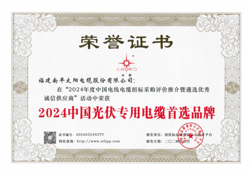 近日,太陽電纜憑借其產(chǎn)品質(zhì)量、技術(shù)研發(fā)能力,成功斬獲“2024中國光伏專用電纜首選品牌”的殊榮。這一榮譽的獲得,不僅是對太陽電纜在光伏專用電纜領(lǐng)域的專業(yè)能力和市場地位的認可,更是對其持續(xù)創(chuàng)新、追求卓越精神的肯定。