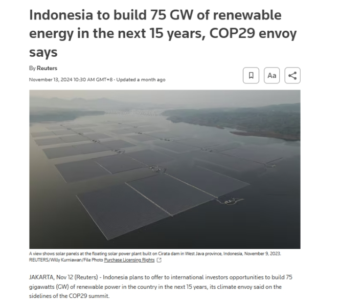 “我們需要努力實現(xiàn)目標(EBT組合)。到2025年,我們的目標是23%的EBT組合,”印尼能源和礦產(chǎn)資源部部長ArifinTasrif表示。為實現(xiàn)這一目標,當?shù)卣扇×硕嘀嘏e措,吸引外國投資,加快能源轉(zhuǎn)型。COP29 峰會期間,印尼氣候特使就曾表示,計劃向國際投資者提供未來15年在該國建設(shè)75GW可再生能源機會。“該計劃是印尼新總統(tǒng)普拉博沃·蘇比安托的承諾。