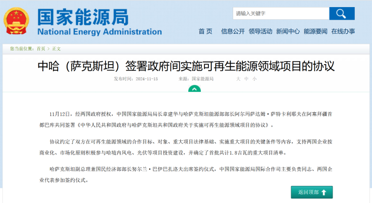 2024年11月12日,中國國家能源局局長章建華與哈薩克斯坦能源部部長阿爾瑪薩達姆·薩特卡利耶夫在阿塞拜疆首都巴庫共同簽署了《中華人民共和國政府與哈薩克斯坦共和國政府關(guān)于實施可再生能源領(lǐng)域項目的協(xié)議》。